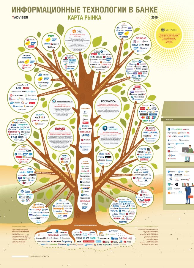 Карта охватила почти 300 игроков рынка – 250 поставщиков ИТ-продуктов, применяемых для цифровизации основных процессов банковской деятельности, и более 40 разработчиков решений для обеспечения информационной безопасности.
