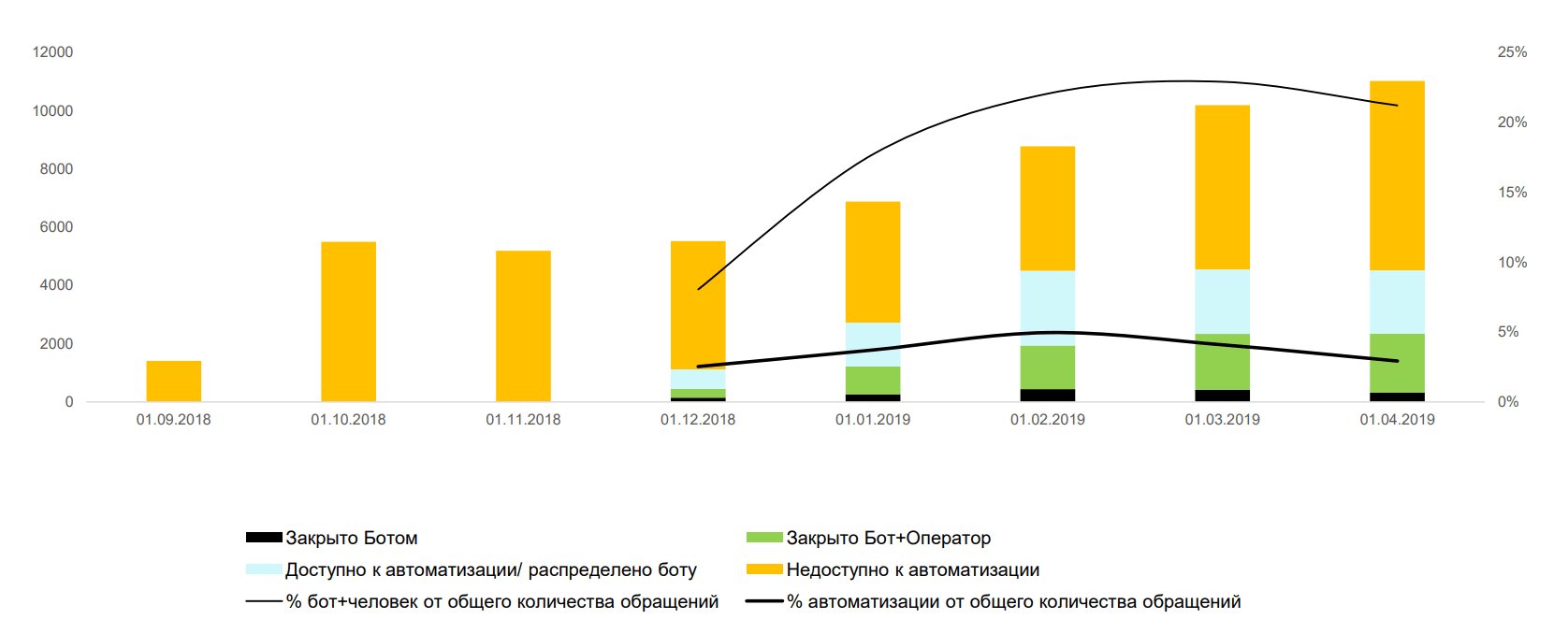 - В связке «бот+оператор» удалось автоматизировать около 5% обращений.