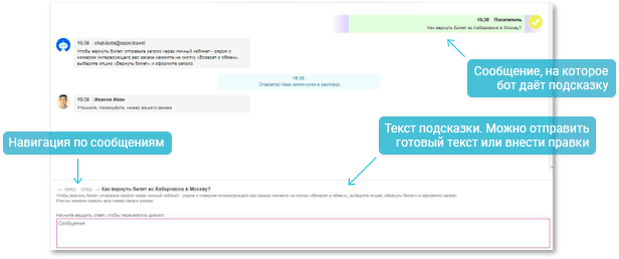 Для операторов есть бот-суфлер, встроенный в интерфейс Webim, позволяющий сократить время ответа оператора. Как это работает: оператор выделяет определенное сообщение клиента, бот распознает просьбу клиента и предлагает подходящий ответ. На этом примере клиент просит удалить из заказа часть билетов, а бот предлагает варианты билетов.