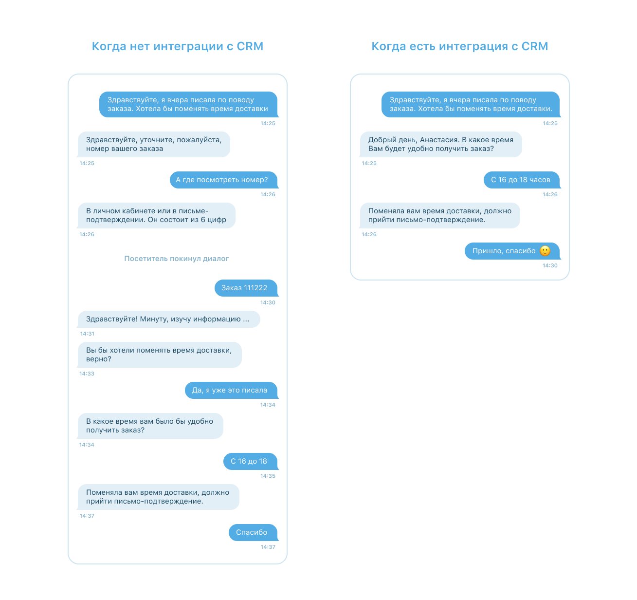 - Сразу настроили интеграцию с CRM для единовременного сохранения контактов. Благодаря этой опции в любой момент можно посмотреть, с чем обращался клиент. Это позволило персонализировать общение в чате.
