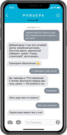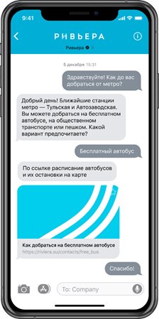 Чтобы начать общение в Apple Business Chat, клиенту нужно кликнуть на специальную иконку на сайте ТРЦ «Ривьера» (ее увидят только пользователи устройств на iOS) или на иконку в карточке ТРЦ в Apple Maps. Диалог с оператором откроется во встроенном приложении «Сообщения», поэтому клиенты могут вернуться к нему в любое удобное время.