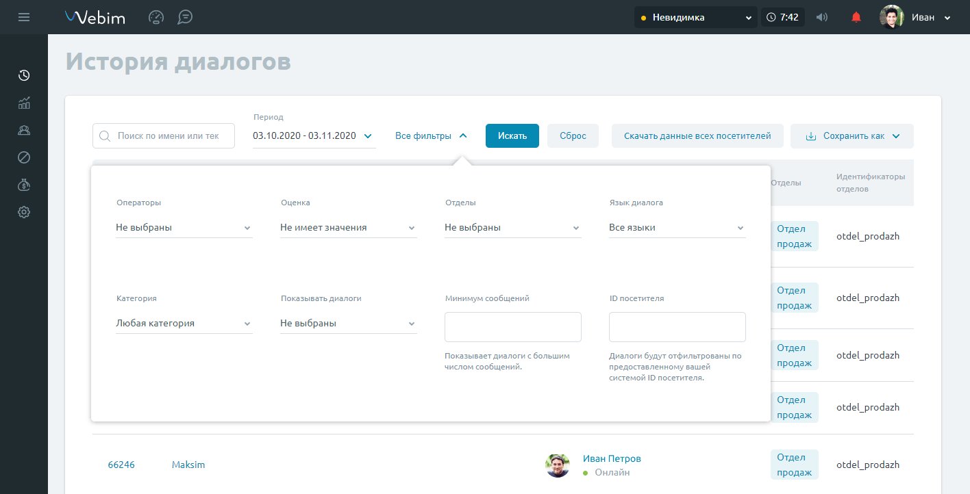 - Страница История диалогов стала более функциональной и удобной для пользователя. Усовершенствован дизайн, появилось более удобное отображение фильтров, а также возможность их сброса.