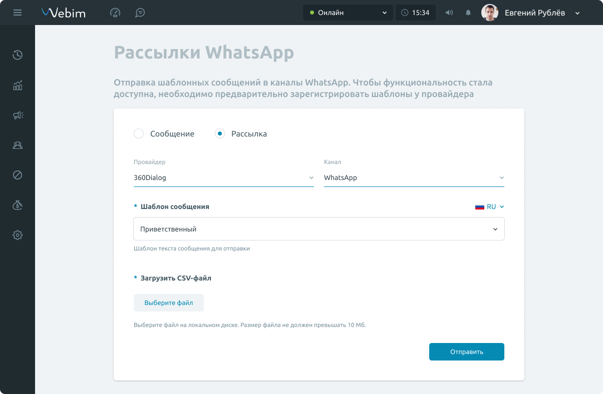 - Функциональность рассылок дополнена новой возможностью рассылать сообщения абонентам WhatsApp по шаблону, включая рассылку пользователям, с которыми еще не велись чаты в Webim. Осуществлять рассылки теперь можно в чаты из WhatsApp через отдельный интерфейс в Панели управления Webim. На данный момент рассылки функционируют при подключении к WhatsApp через провайдера 360Dialog.