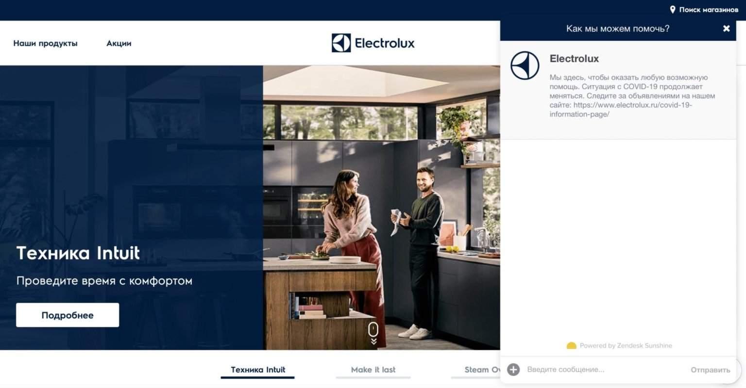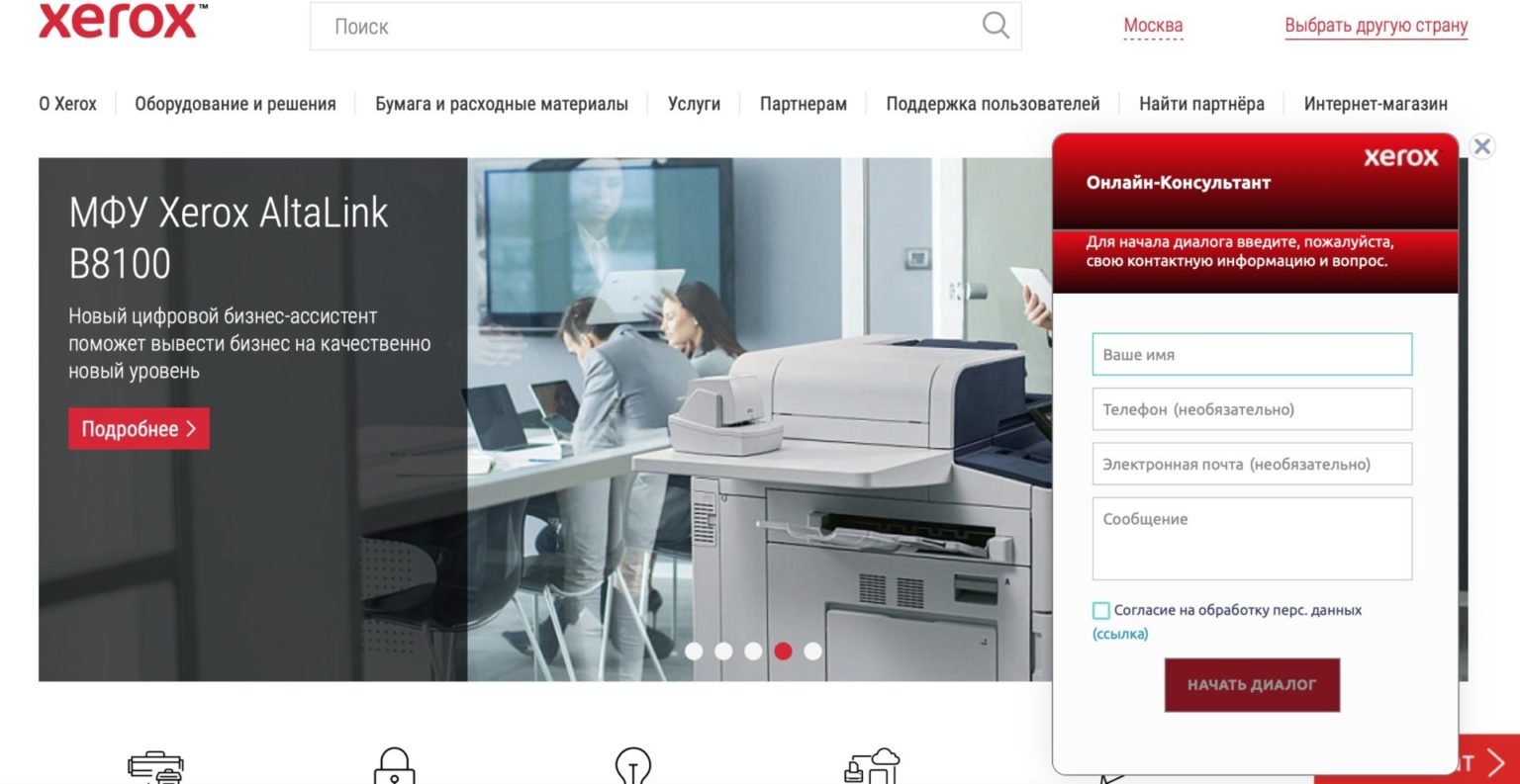В зависимости от того, какой стиль выбран для дизайна сайта компании, дизайн чата может быть как минималистичным, как, например, у интернет-магазина Комус или Electrolux, так и более сложным (примером может выступить чат на сайте компании Xerox, в котором был использован градиент для создания эффекта объемности):