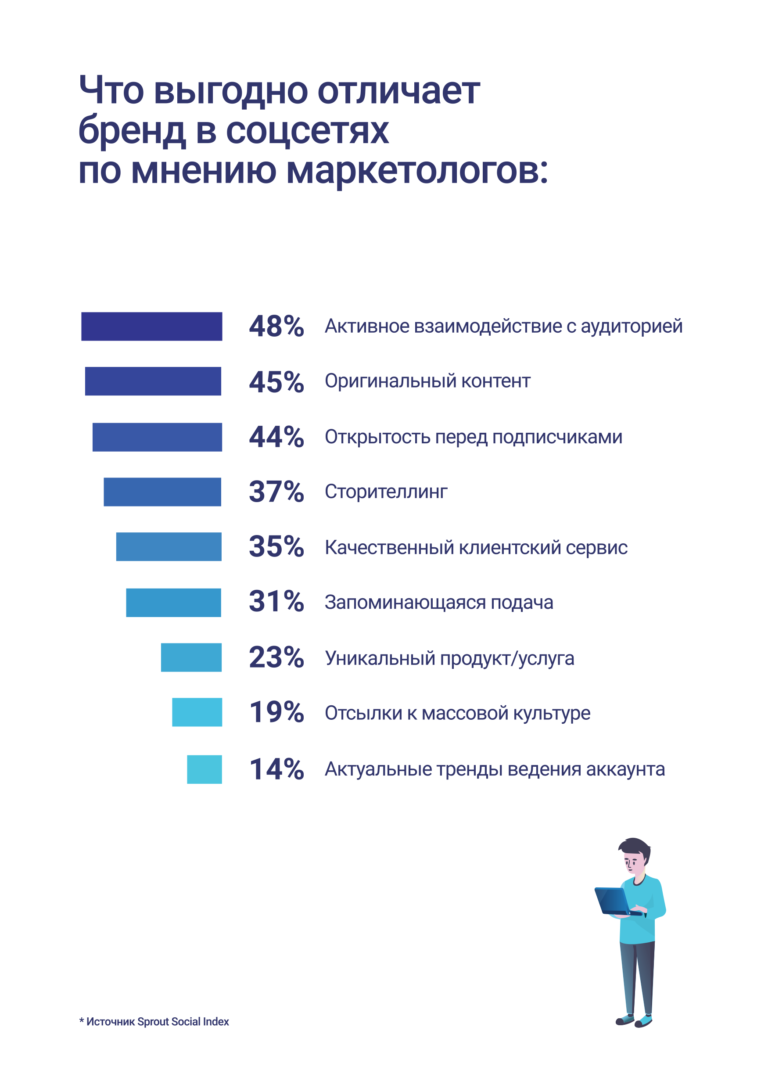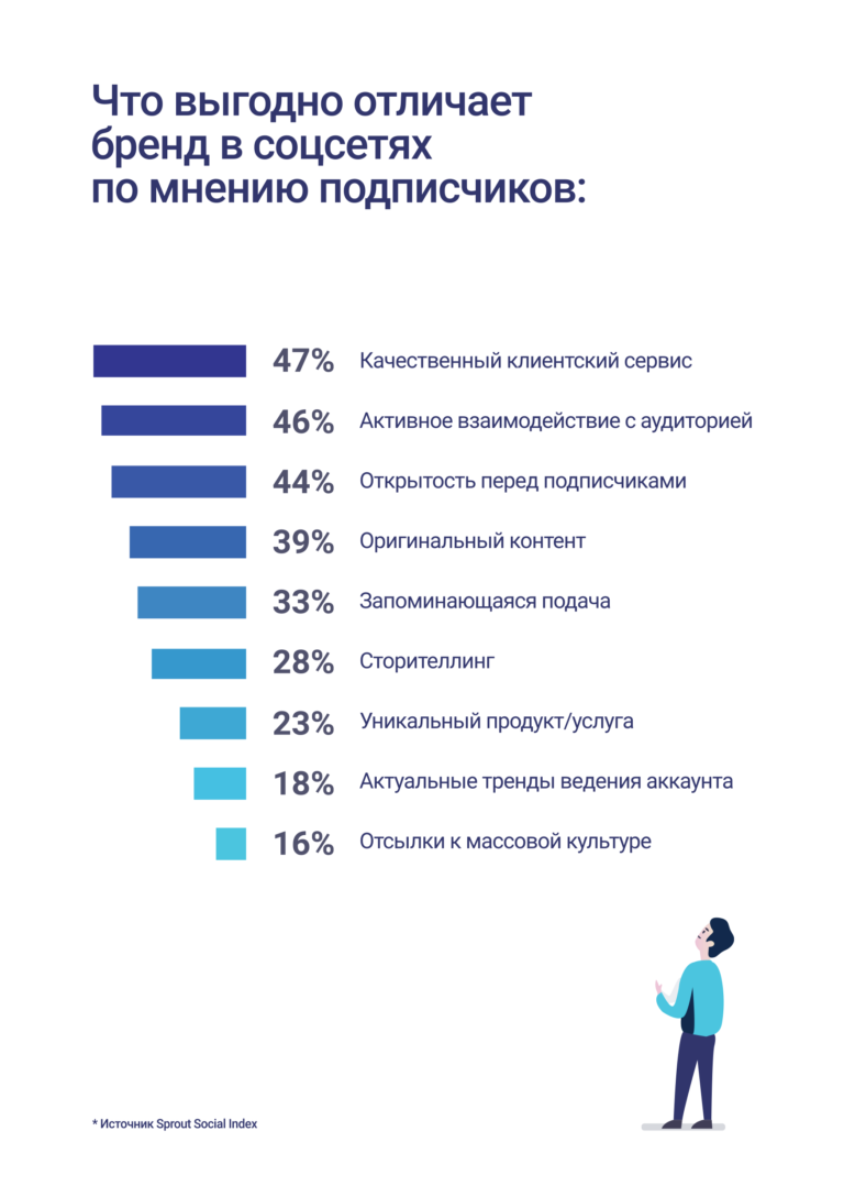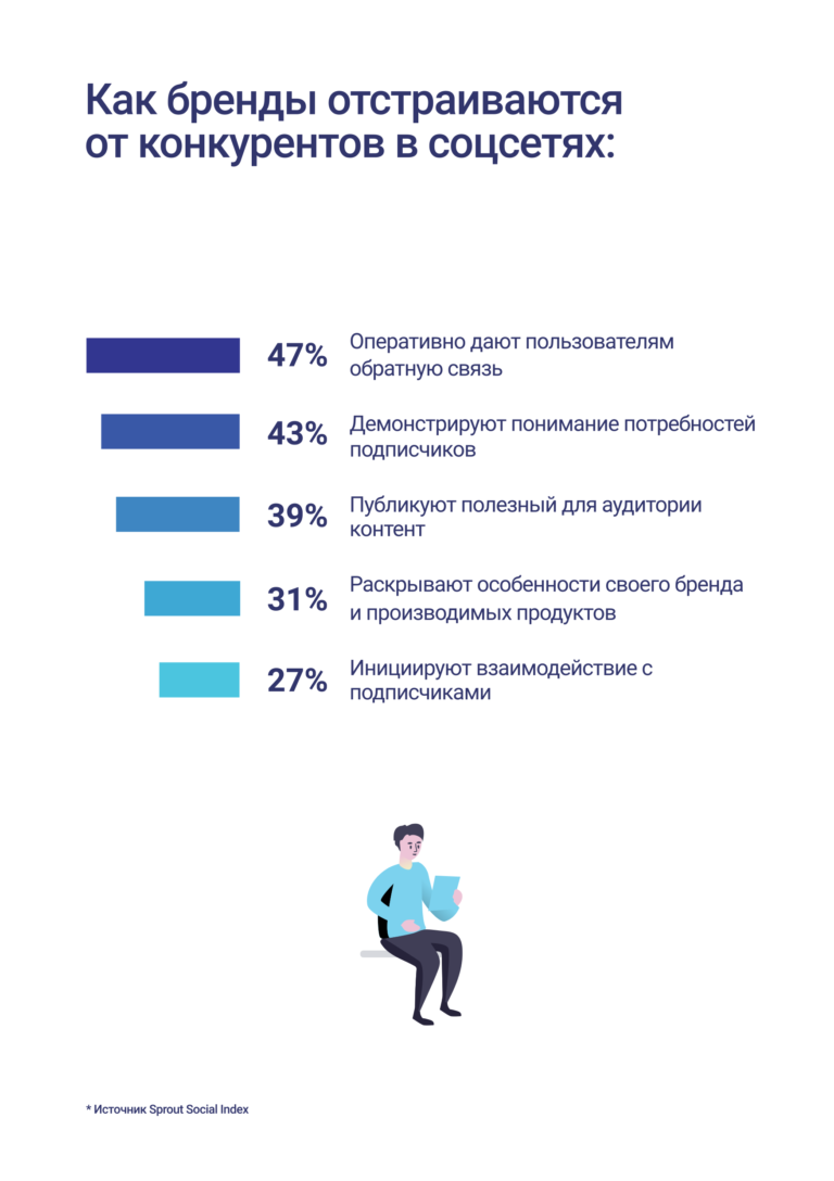 Безусловно, под качественным сервисом пользователь подразумевает оперативный ответ сотрудника компании, который будет обладать достаточной компетентностью, чтобы решить возникшую проблему. А если при этом еще и используется привычный для клиента способ связи, то такое обслуживание точно оставит у него хорошее впечатление. Таким образом шансы на то, что в будущем он станет постоянным покупателем или заказчиком, значительно возрастают. Уже сегодня многие бренды развивают коммуникативную стратегию, чтобы выделяться среди своих конкурентов в соцсетях. 47% опрошенных брендов предпочитают вовремя давать подписчикам обратную связь, а 45% – стараются продемонстрировать пользователям, что понимают их потребности.