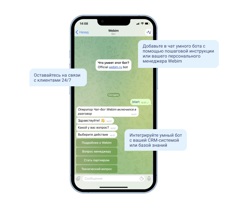Подключите умного бота с помощью External Bot API и оставайтесь на связи 24/7.