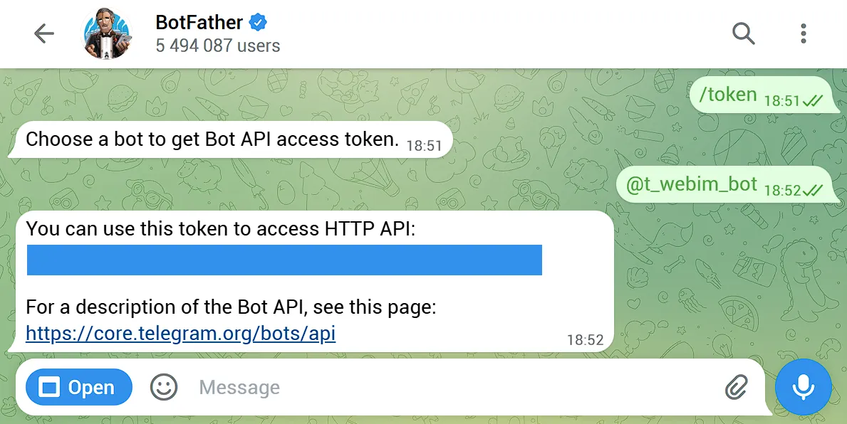 | Токен авторизации бота | Чтобы начать работу с ботом в Telegram, понадобится знать токен (маркер) этого бота. Этот токен необходим для использования Telegram Bot API от имени Вашего бота. Данный токен вы получили, когда только создавали своего бота, обращаясь к BotFather: ![]() Подробно процесс получения токена описан в документации сервиса Telegram |