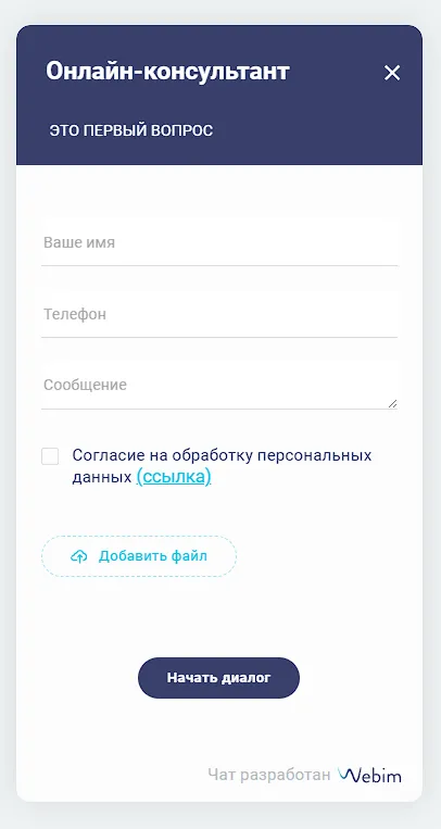Имя,Телефон) в соответствии с настройками размещения. - Поле «Сообщение» (если требуется отправка первого сообщения перед началом диалога).