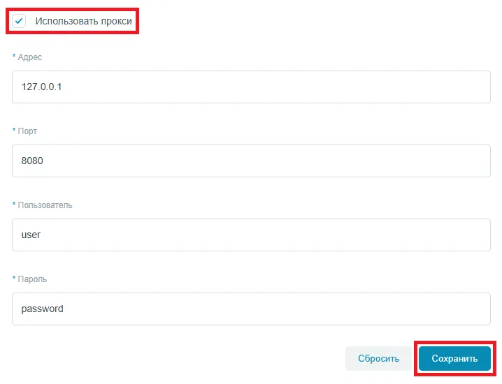 В нижней части формы включите опцию Использовать прокси, заполните поля и нажмите Сохранить.