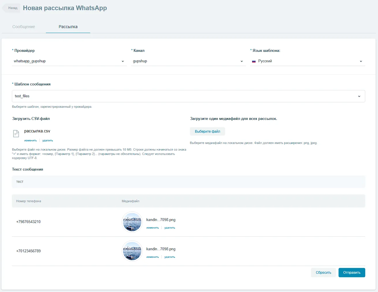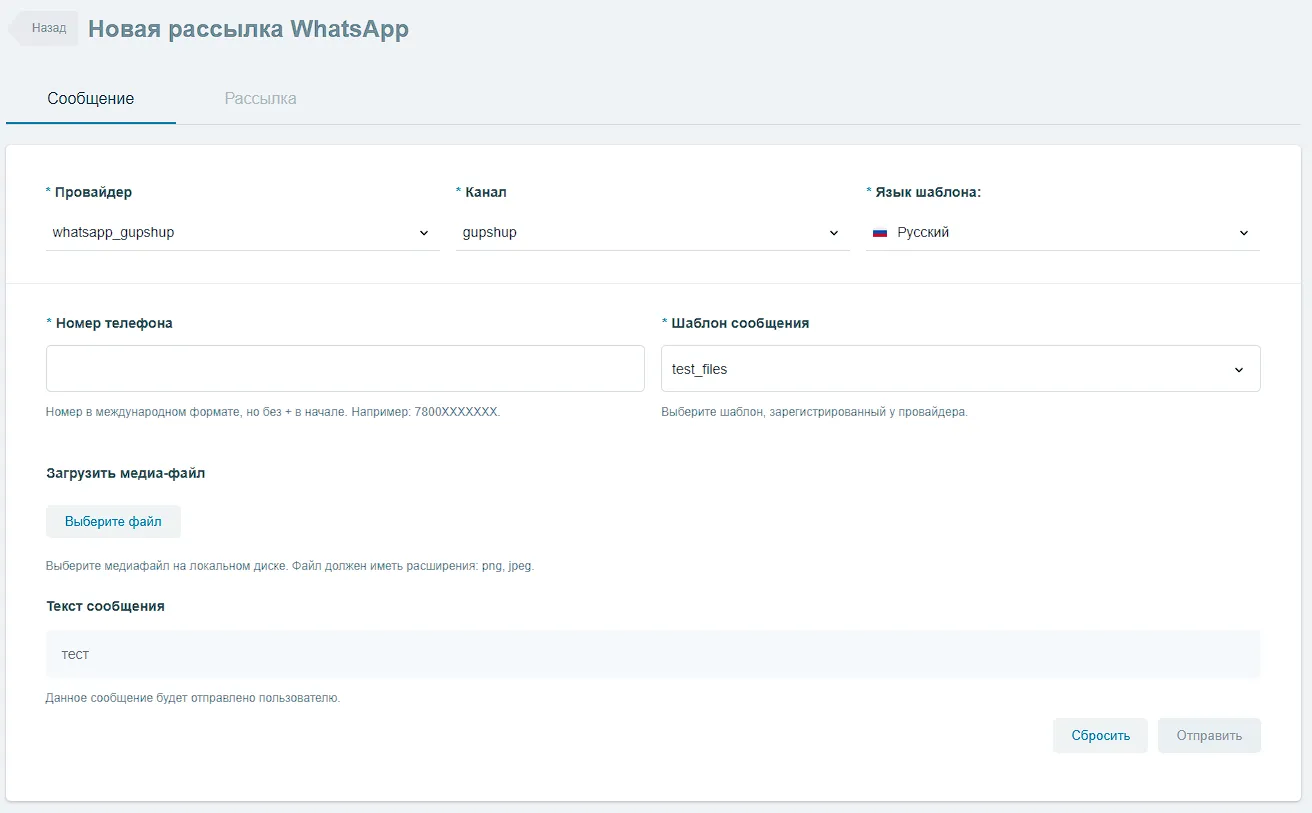 Вложение: если выбранный шаблон у провайдера поддерживает медиа, появляется поле Загрузить медиа-файл. Допустимые типы/расширения файлов зависят от шаблона и ограничений провайдера. В интерфейсе загрузки отображаются разрешённые расширения.
