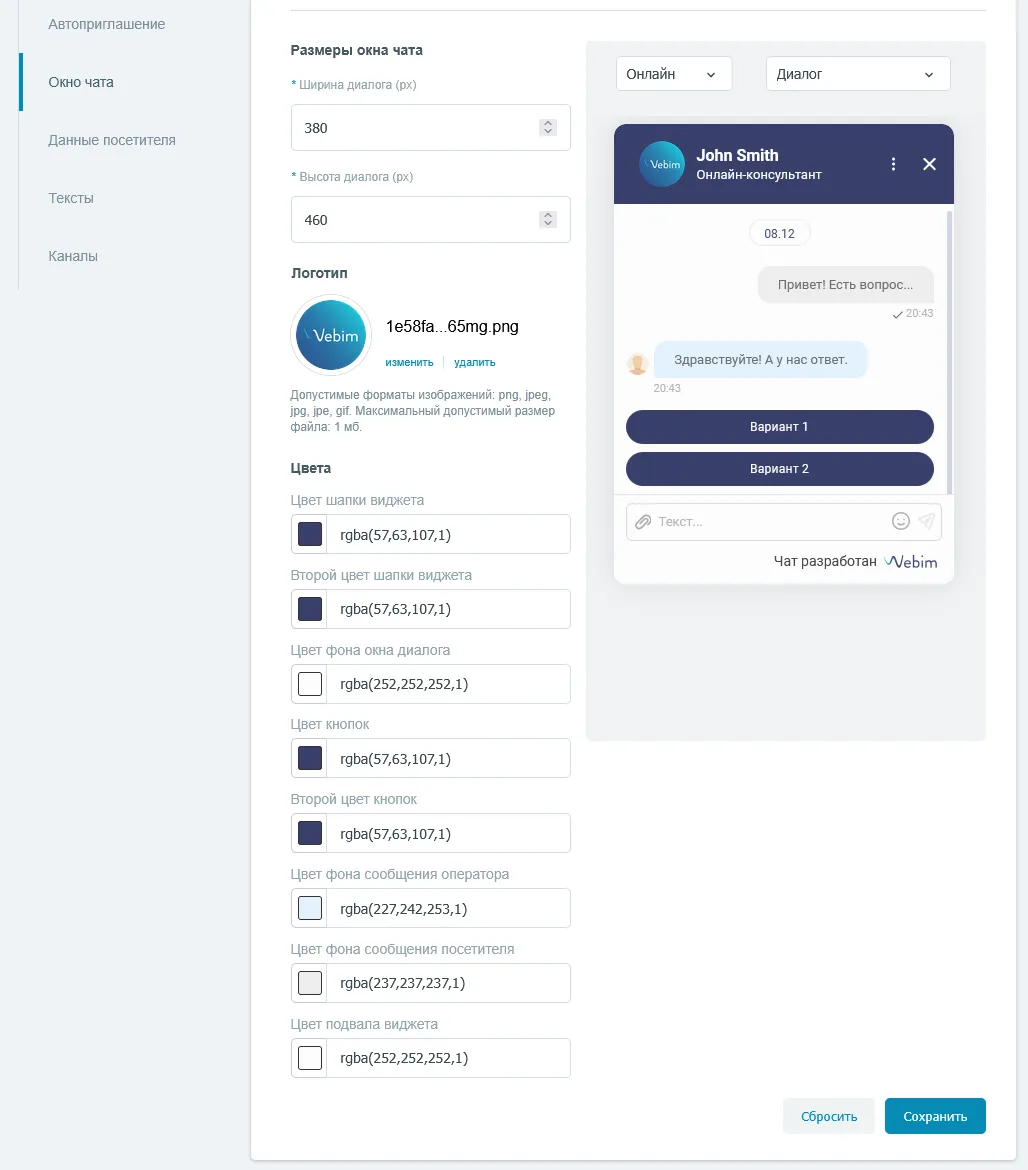 На этой же вкладке задаются Размеры окна чата (поля Ширина диалога (px) и Высота диалога (px)), но они не влияют на допустимые форматы и максимальный размер файла логотипа.