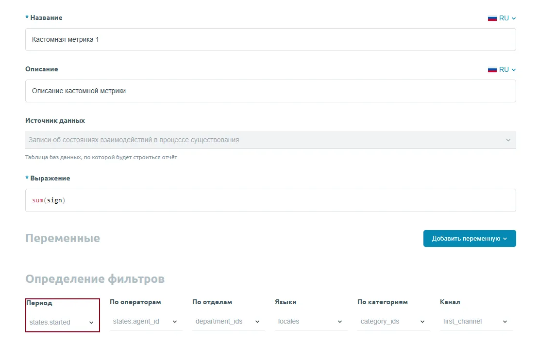 В редакторе метрик присутствует возможность изменить логику фильтров, например, если метрика создана для источника "Записи о состояниях взаимодействий в процессе существования", то значение фильтра Период она использует для фильтрации по колонке states.started.