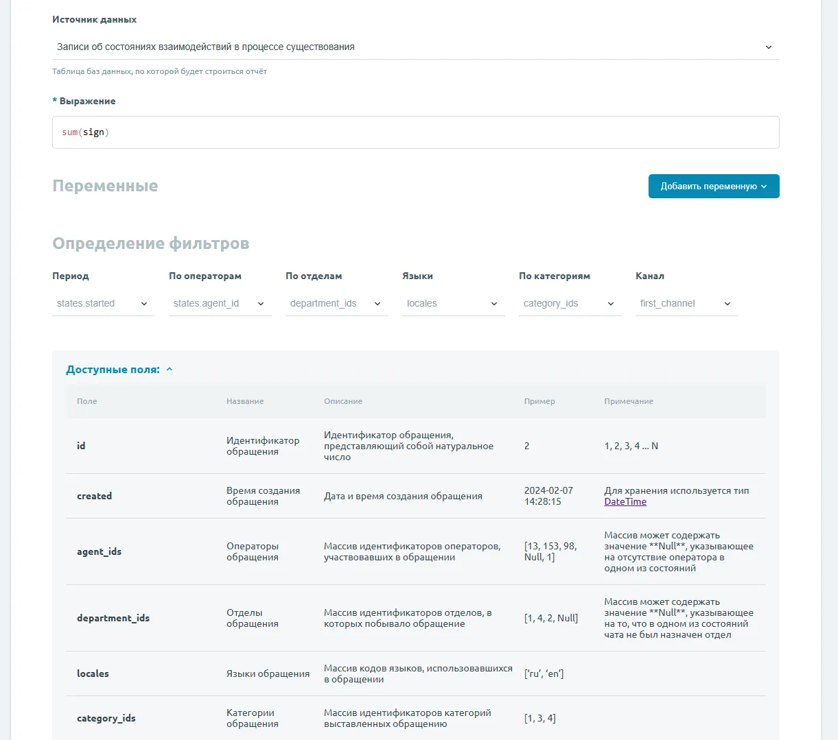 Раскрывающийся блок Доступные поля отображает доступные для обращения поля, определённые текущим источником данных. Для источников, связанных с чатами (thread_source, thread_state_source, thread_message_source и т. п.), в список полей добавлено location (Размещение). Поле location можно использовать в выражениях метрик и для последующей группировки отчётов.
