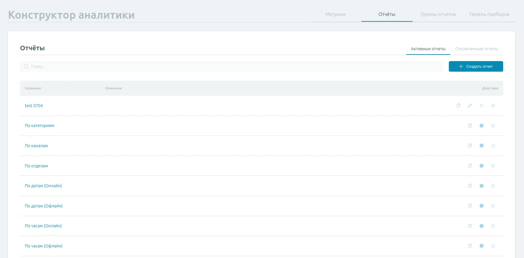 Все отчёты, выводимые в Статистике и Панели приборов (кроме отчетов по умолчанию) являются настраиваемыми (то есть, могут быть настроены в зависимости от ваших нужд, в том числе отчёты могут быть созданы и удалены). Создание и редактирование отчетов и метрик реализовано в Конструкторе аналитики (Аналитика -> Конструктор аналитики).