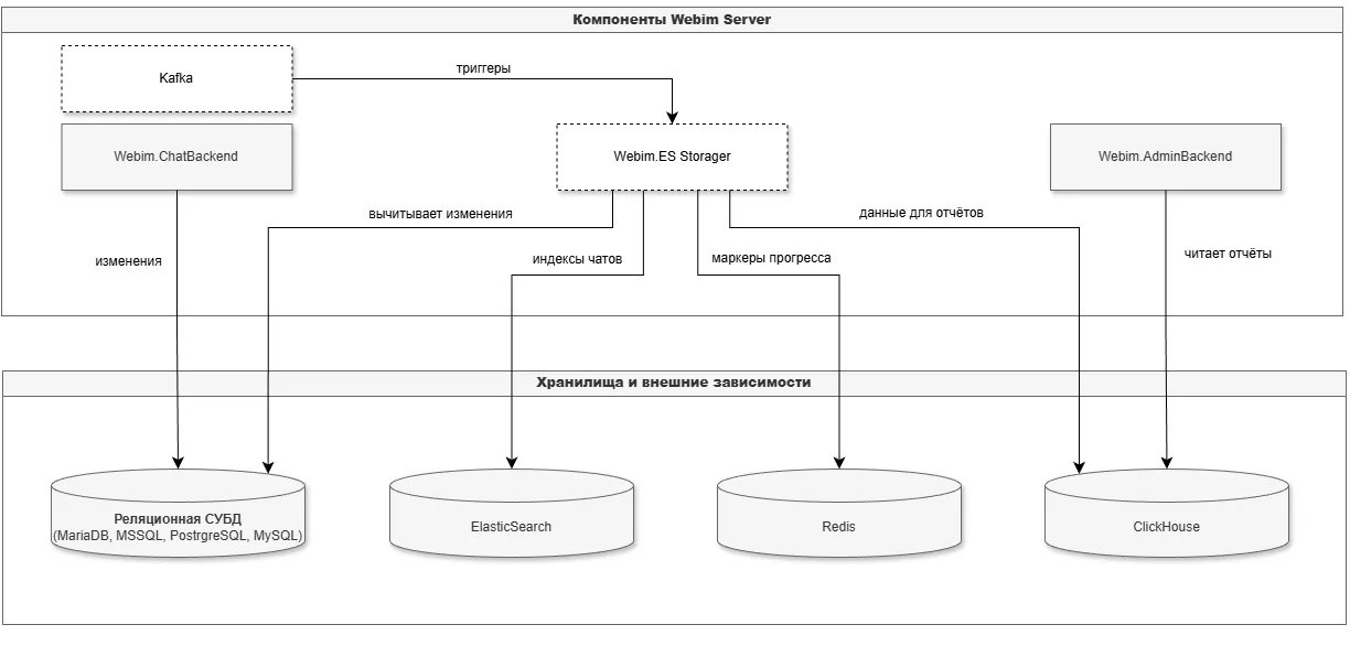 Storager получает триггеры через Kafka и вычитывает данные из основной БД Webim. Внутренние детали реализации в этом разделе не рассматриваются.