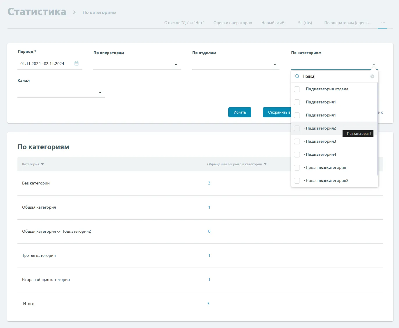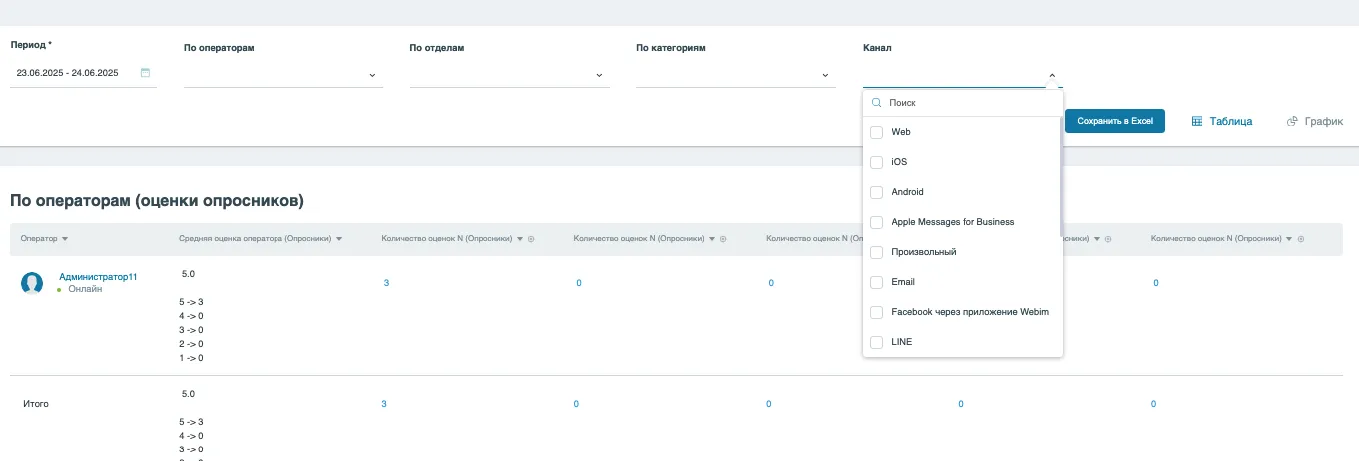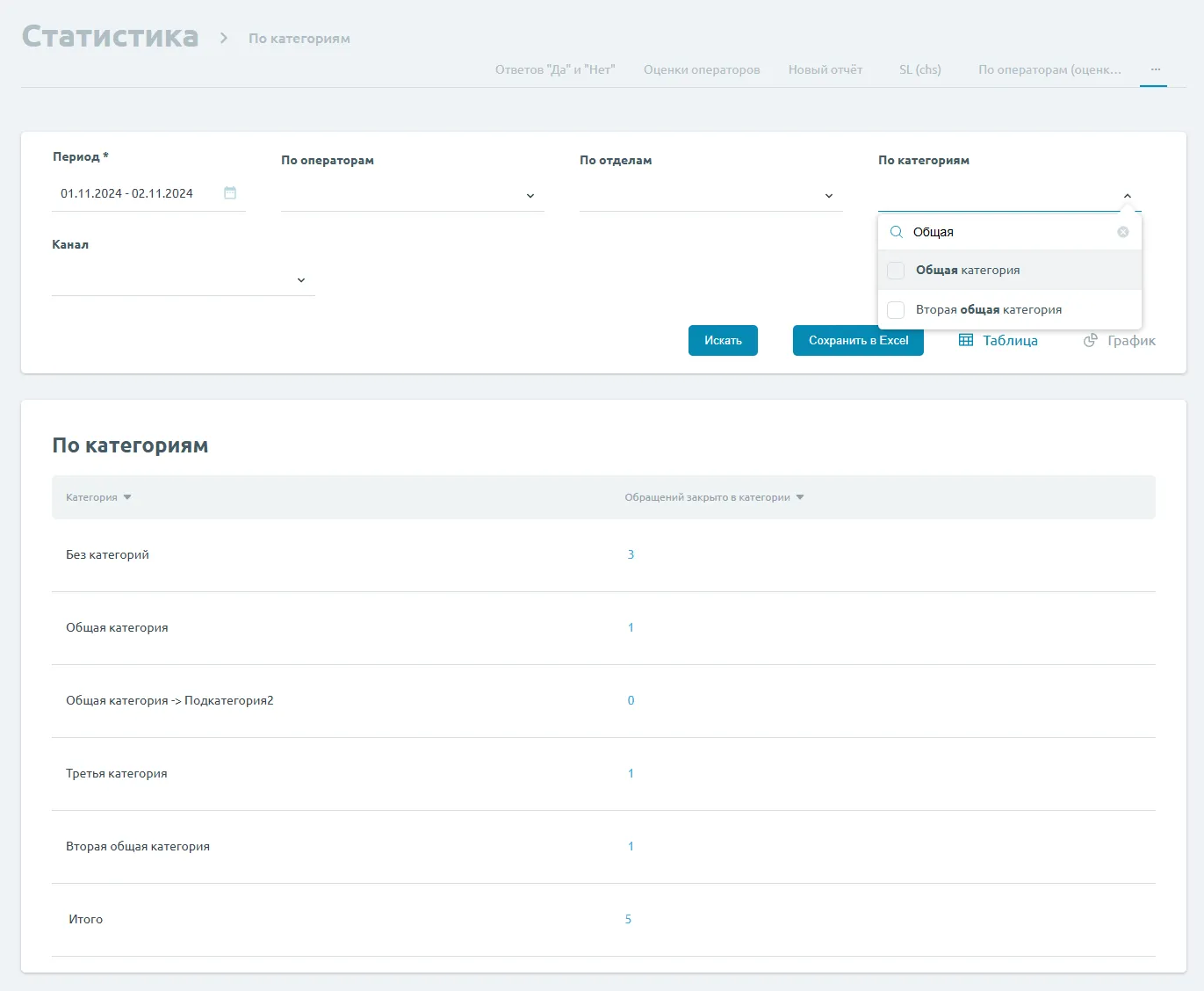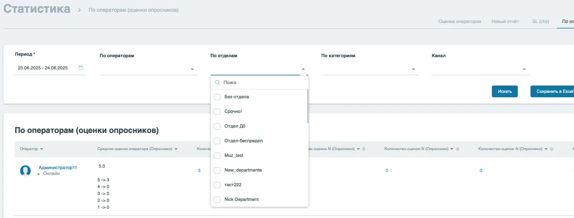 Сбрасываются только фильтры (период, операторы, отделы, категории, канал).
