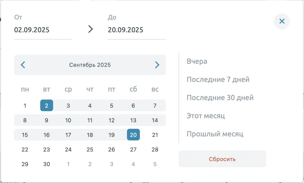 Фильтры периода позволяют настроить временной период, за который производится выборка данных по параметру, указанному в названии фильтра.