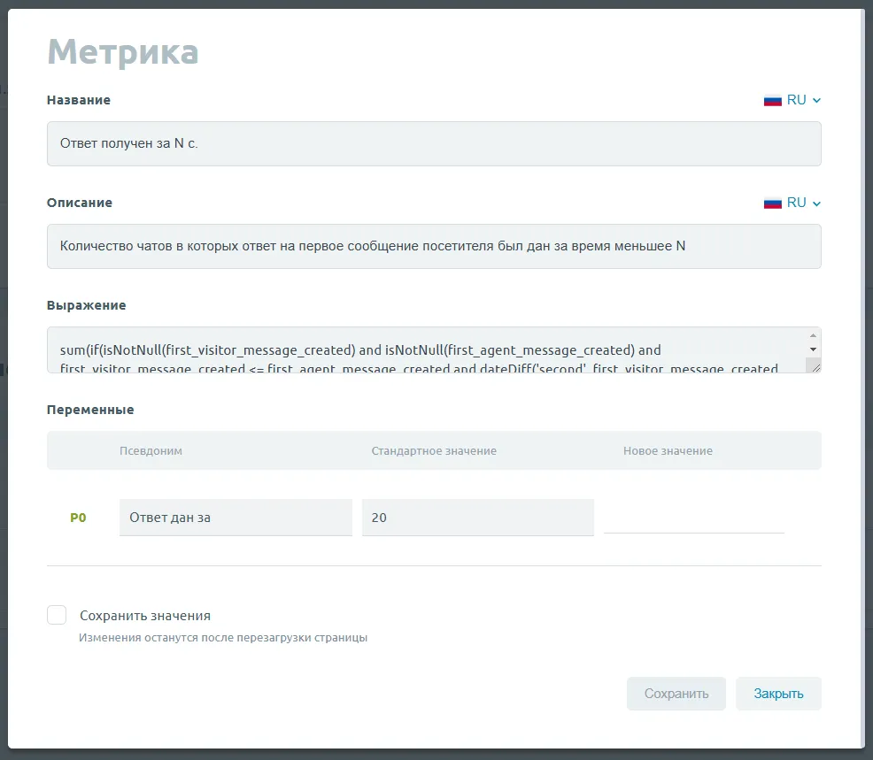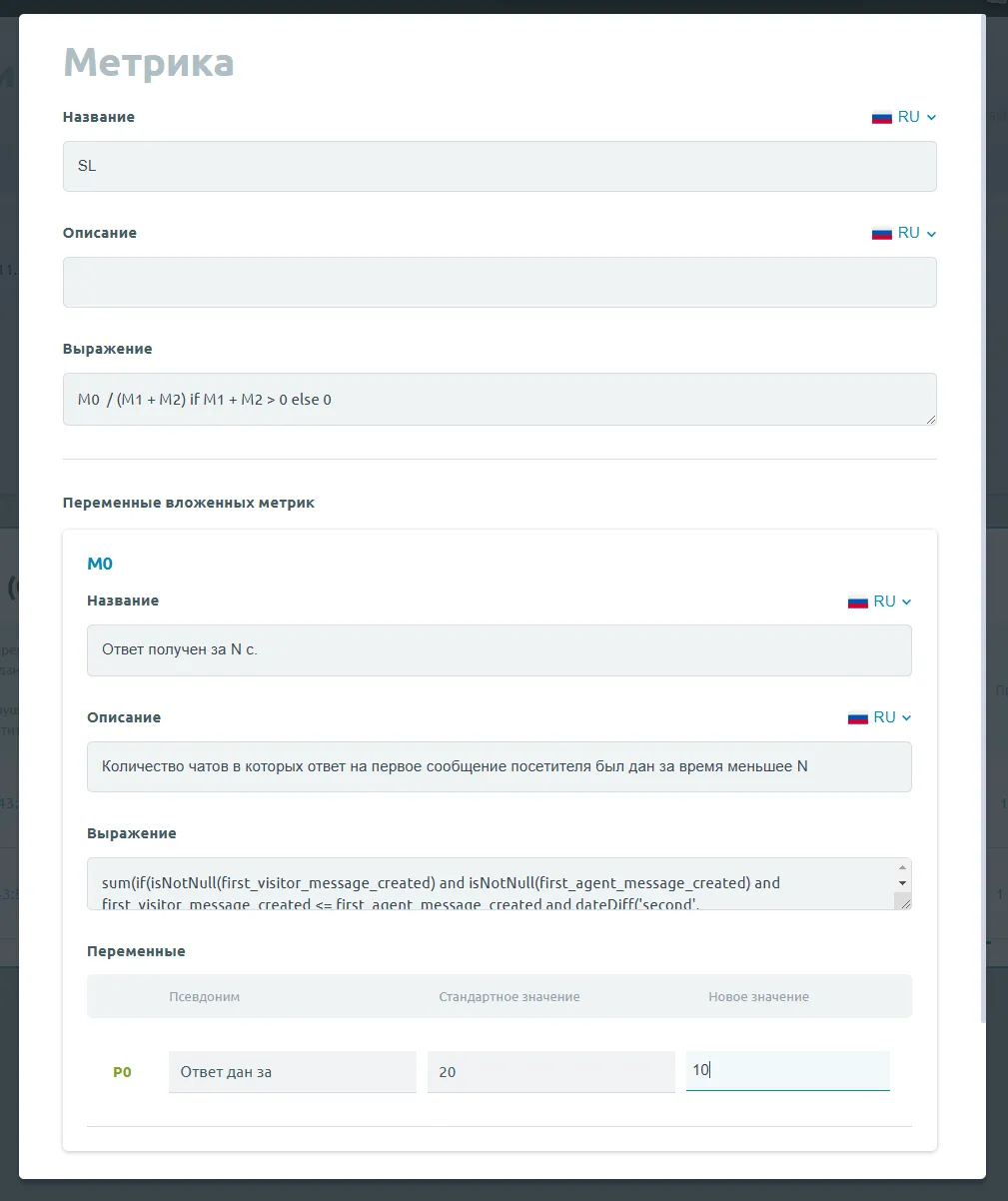 - В случае, если это обычное поле с одной метрикой, тогда в модальном окне будет отображена формула метрики и список переменных для изменения.