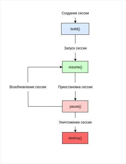Началом сессии считается выполнение метода resume(), а завершением — выполнение метода destroy(), либо аварийная остановка приложения.